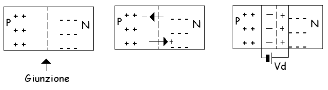 La giunzione P-N: quando due parti di semiconduttore, una drogata di tipo P e l' altra drogata di tipo N vengono messe a stretto contatto, (o meglio quando una barretta di semiconduttore viene in parte drogata di tipo P e in parte di tipo N), si forma una zona dalle caratteristiche particolari denominata giunzione (fig. 6.1.a). Immediatamente tra il semiconduttore di tipo P e quello di tipo N avviene un fenomeno di diffusione delle cariche, cioè le cariche libere di tipo P si spostano verso la zona di tipo N, viceversa le cariche libere di tipo N si spostano verso la zona di tipo P. Questo movimento di cariche, (che tende a riportare l' equilibrio tra elettroni e lacune) si chiama corrente di diffusione. La durata della corrente di diffusione è molto limitata, difatti appena si viene ad avere la presenza di lacune nella zona di tipo N, e la presenza di elettroni nella zona di tipo P, nasce un campo elettrico con il positivo nella zona di tipo N, e col negativo nella zona di tipo P, e le cariche che attraversano la giunzione devono via via superare una barriera di potenziale sempre maggiore. Quando il campo elettrico diventa sufficientemente elevato, la corrente di diffusione viene annullata, in quanto si genera una seconda corrente detta di drift (corrente di campo) che ha senso opposto alla corrente di diffusione (fig. 6.1.b). L' effetto della giunzione è quello di dar luogo ad una zona di svuotamento delle cariche (depletion layer) tra la zona P e la zona N (fig. 6.1.c). La larghezza di questa zona dipende dalla concentrazione dei droganti, mentre il potenziale di giunzione (Vd) è di circa 0,7V per il silicio e di 0,3V per il germanio.